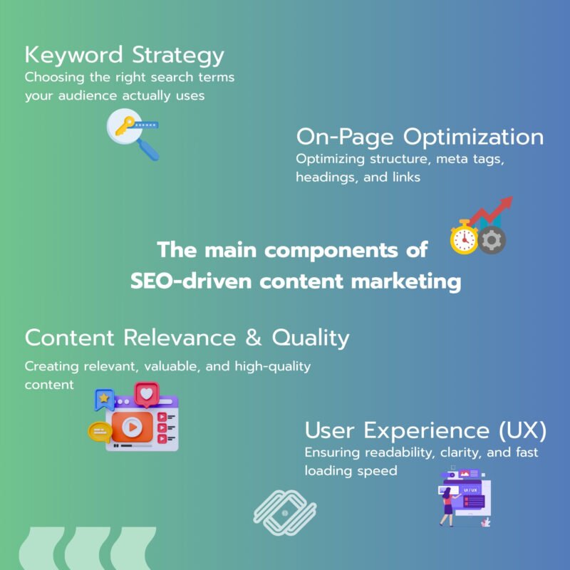 The main components of SEO-driven content marketing include: