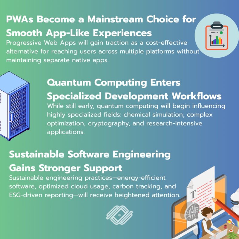 Overview: Sustainable engineering practices—energy-efficient software, optimized cloud usage, carbon tracking, and ESG-driven reporting—will receive heightened attention. Organizations will adopt tools to measure emissions from compute workloads and optimize architectures for lower resource consumption.
