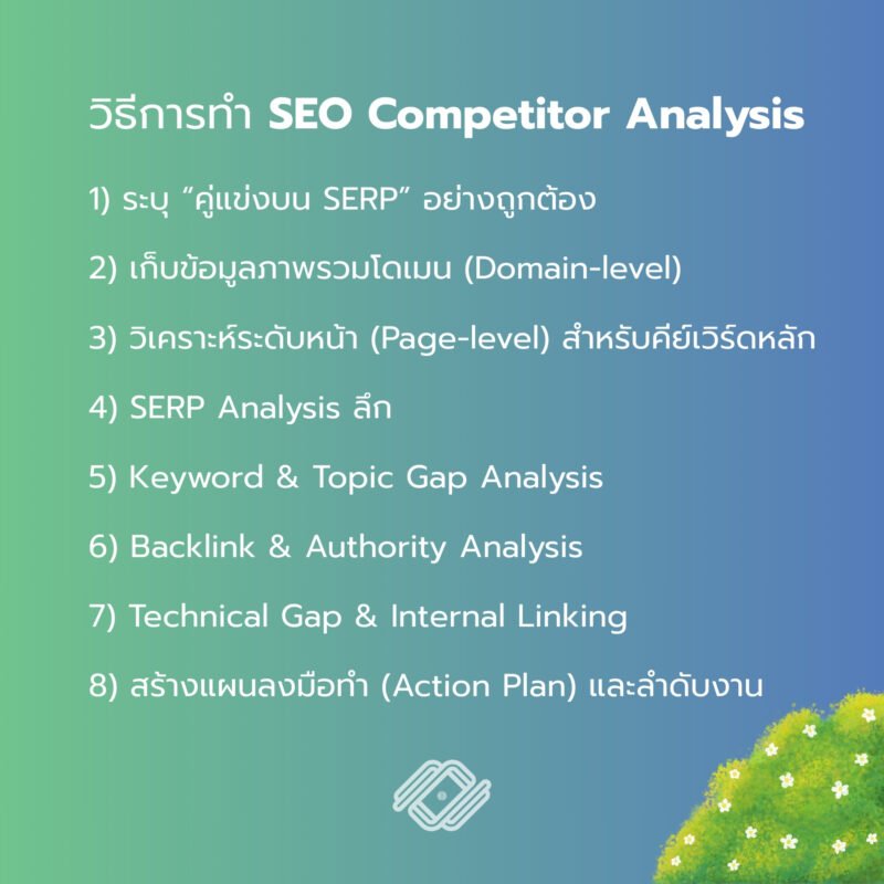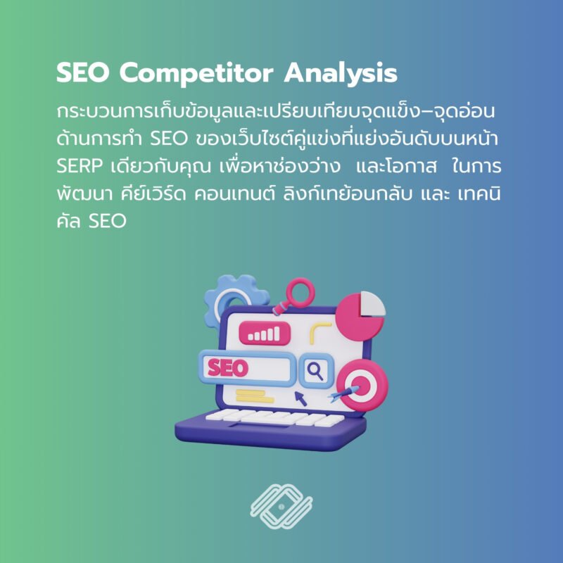 SEO Competitor Analysis คือกระบวนการเก็บข้อมูลและเปรียบเทียบจุดแข็ง–จุดอ่อนด้านการทำ SEO ของเว็บไซต์คู่แข่งที่แย่งอันดับบนหน้า SERP เดียวกับคุณ (มิใช่แค่คู่แข่งทางธุรกิจ) เพื่อหาช่องว่าง (gaps) และโอกาส (opportunities) ในการพัฒนา คีย์เวิร์ด คอนเทนต์ ลิงก์เทย้อนกลับ (backlinks) และ เทคนิคัล SEO ให้เอาชนะได้อย่างมีแผน ทั้งนี้ แก่นของการวิเคราะห์ไม่ใช่ “คัดลอก” แต่คือ “เรียนรู้–ปรับใช้–ทำให้ดีกว่า” ภายใต้ข้อจำกัดทรัพยากรของคุณ
