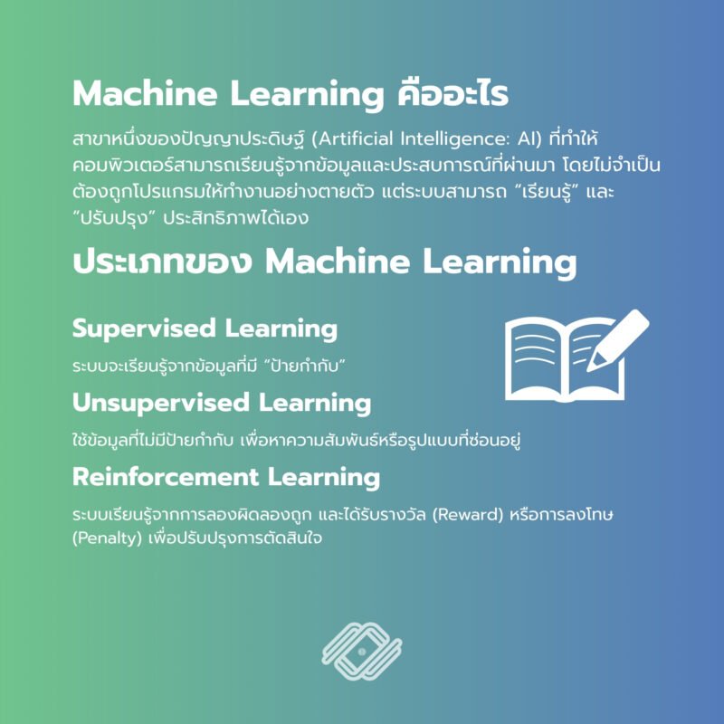 Machine Learning (ML) คือ สาขาหนึ่งของปัญญาประดิษฐ์ (Artificial Intelligence: AI) ที่ทำให้คอมพิวเตอร์สามารถเรียนรู้จากข้อมูลและประสบการณ์ที่ผ่านมา โดยไม่จำเป็นต้องถูกโปรแกรมให้ทำงานอย่างตายตัว แต่ระบบสามารถ “เรียนรู้” และ “ปรับปรุง” ประสิทธิภาพได้เอง ยิ่งมีข้อมูลมากและมีการฝึกสอนที่ดีเท่าไร ระบบก็ยิ่งสามารถคาดการณ์และตัดสินใจได้แม่นยำมากขึ้น