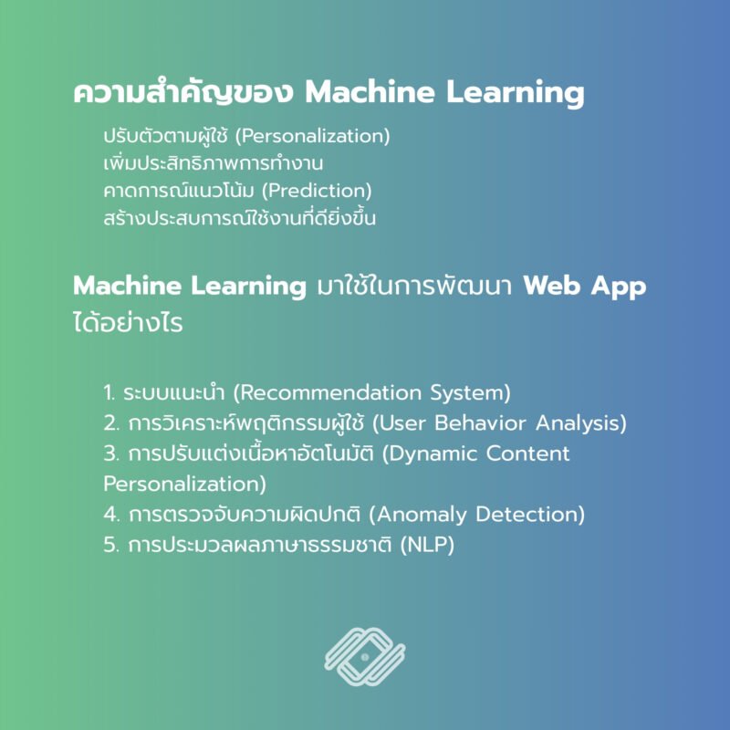 Machine Learning ไม่เพียงแต่เป็นเทคโนโลยีที่ช่วยให้ Web App มีความฉลาดขึ้น แต่ยังสามารถสร้างประสบการณ์ที่ตรงใจและตอบโจทย์ผู้ใช้มากยิ่งขึ้น หากนักพัฒนานำ ML มาประยุกต์ใช้อย่างเหมาะสม ก็จะช่วยเพิ่มทั้งคุณค่าและความพึงพอใจให้กับผู้ใช้งาน รวมถึงสร้างความได้เปรียบในการแข่งขันทางธุรกิจในยุคดิจิทัล