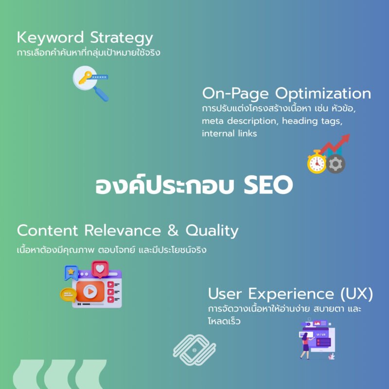- On-Page Optimization: การปรับแต่งโครงสร้างเนื้อหา เช่น หัวข้อ, meta description, heading tags, internal links