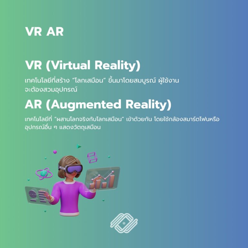 - AR (Augmented Reality) คือเทคโนโลยีที่ “ผสานโลกจริงกับโลกเสมือน” เข้าด้วยกัน โดยใช้กล้องสมาร์ตโฟนหรืออุปกรณ์อื่น ๆ แสดงวัตถุเสมือน (3D models, ข้อความ, ภาพ) ซ้อนทับบนภาพจริง เช่น การลองวางเฟอร์นิเจอร์ในห้องผ่านกล้องมือถือ หรือการทดลองใส่สินค้าผ่านหน้าจอ