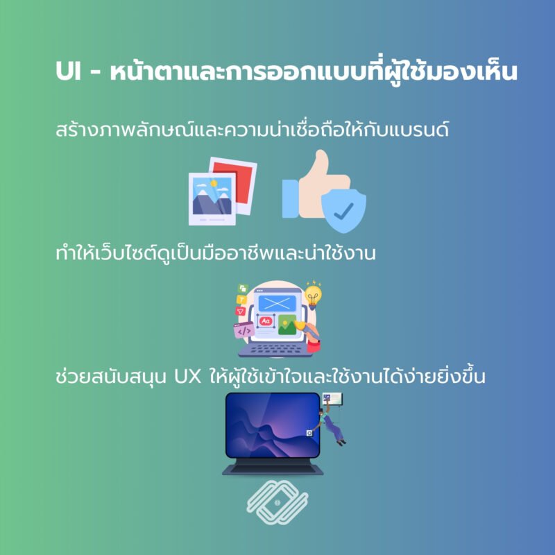 UI คือการออกแบบส่วนที่ผู้ใช้งานมองเห็นและโต้ตอบได้ เช่น สี ฟอนต์ ปุ่ม เมนู และการจัดวางองค์ประกอบต่าง ๆ บนหน้าเว็บไซต์