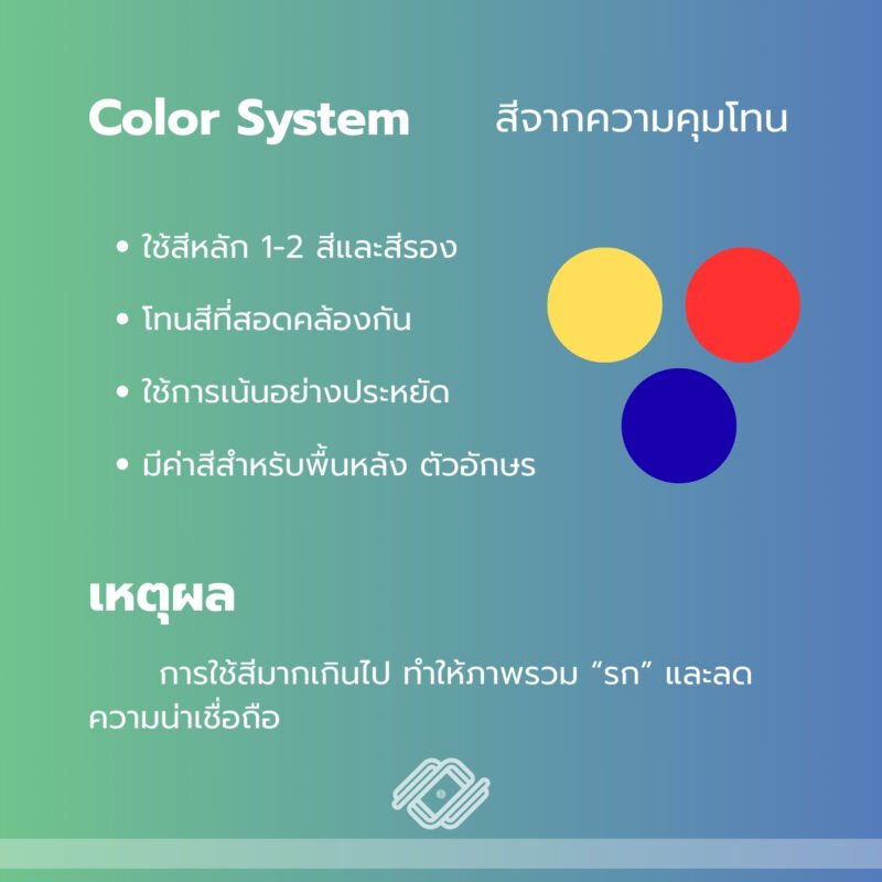 - ใช้สีหลัก 1–2 สี และสีรองอย่างมีเหตุผล