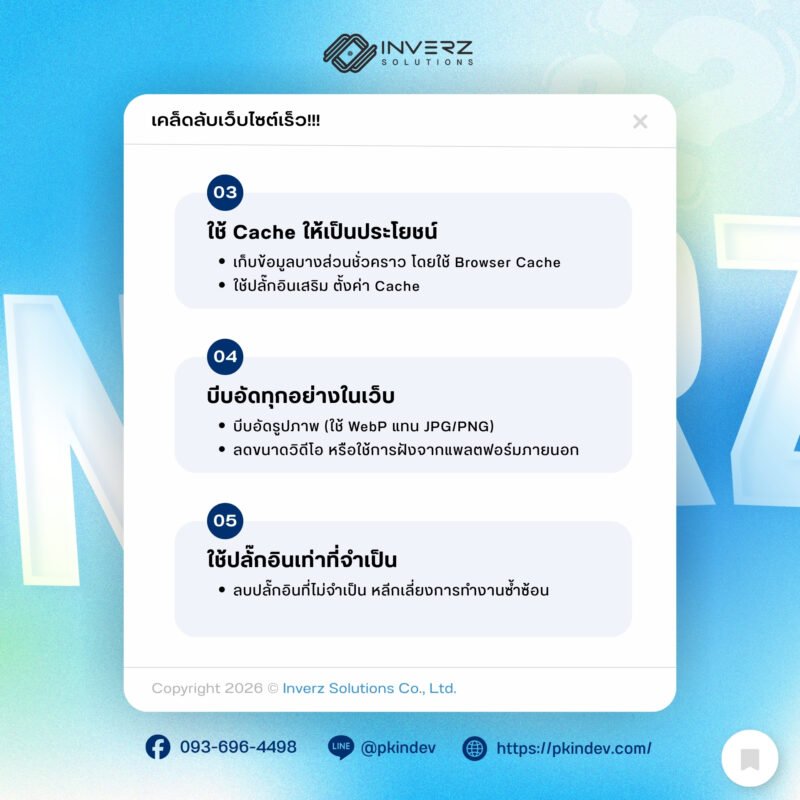 - ใช้ปลั๊กอิน Cache (สำหรับ WordPress เช่น WP Rocket, LiteSpeed Cache)