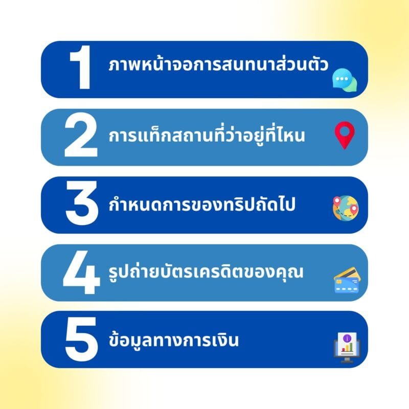 - ข้อมูลทางการเงิน – ถึงแม้การโชว์ยอดเงินในบัญชีจะดูไม่เป็นการเปิดเผยข้อมูลอะไรมาก แต่มันยังมีเลขบัญชี และจำนวนเงินที่แสดงอยู่ ซึ่งในส่วนนี้ก็มากพอที่จะให้เหล่าแฮ็กเกอร์สามารถปลอมเป็นคุณแล้วจาะเข้าไปในบัญชีเพื่อทำธุรกรรมต่างๆ ได้ รวมถึงอาจจะดึงดูดให้คนที่มาเห็นถือโอกาสเข้ามายืมเงินของคุณอีกด้วย